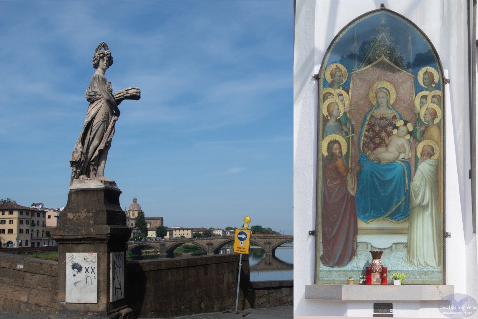 Als je in Toscane bent is een dagje Florence zeker een must. Als je de musea wilt bezoeken heb je aan één dag niet genoeg. We parkeerden de auto net buiten de oude binnenstad aan de zuidkant. In 12 minuten loop je naar de bekende brug Ponte Vecchio. Het grootste gedeelte liepen we langs de Arno. Mooie spiegeling in het water. (beetje veel foto's). Voor ons was het de eerste keer dat we een temperatuur van boven de 40 graden meemaakten. En in de stad was dat best heftig.